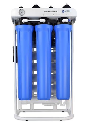 The WECO 0500GAC-CAL-UV RO Water Filter System can provide 500 gallons of purified water daily with five filters with a 100-gallon individual capacity. However, installation can be challenging on your own because the instructions are hard to follow, and the unit weighs around 70 pounds or 30 kg.